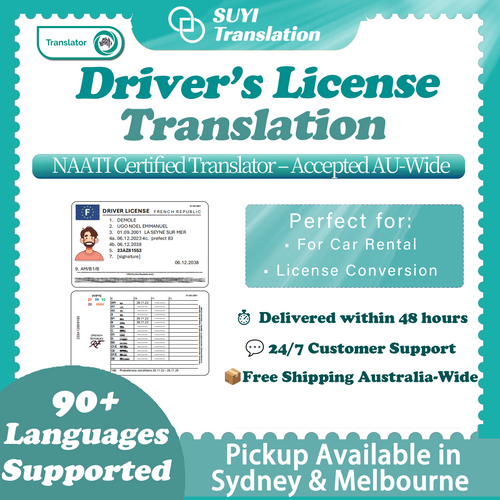 Need your driver’s license translated into English to legally drive in Australia? SUYI Translation offers NAATI-certified translations for all languages, delivered within 48 hours (or as fast as 24 hours for some languages).