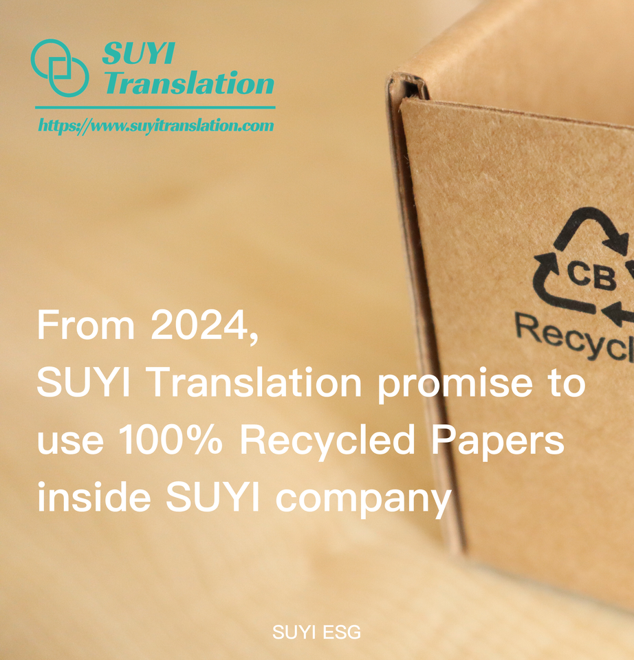 From 2024, SUYI Translation promise to use 100% Recycled Papers inside SUYI company. SUYI is fully committed to leveraging our scale and efficiency to drive a more sustainable economy.🍃